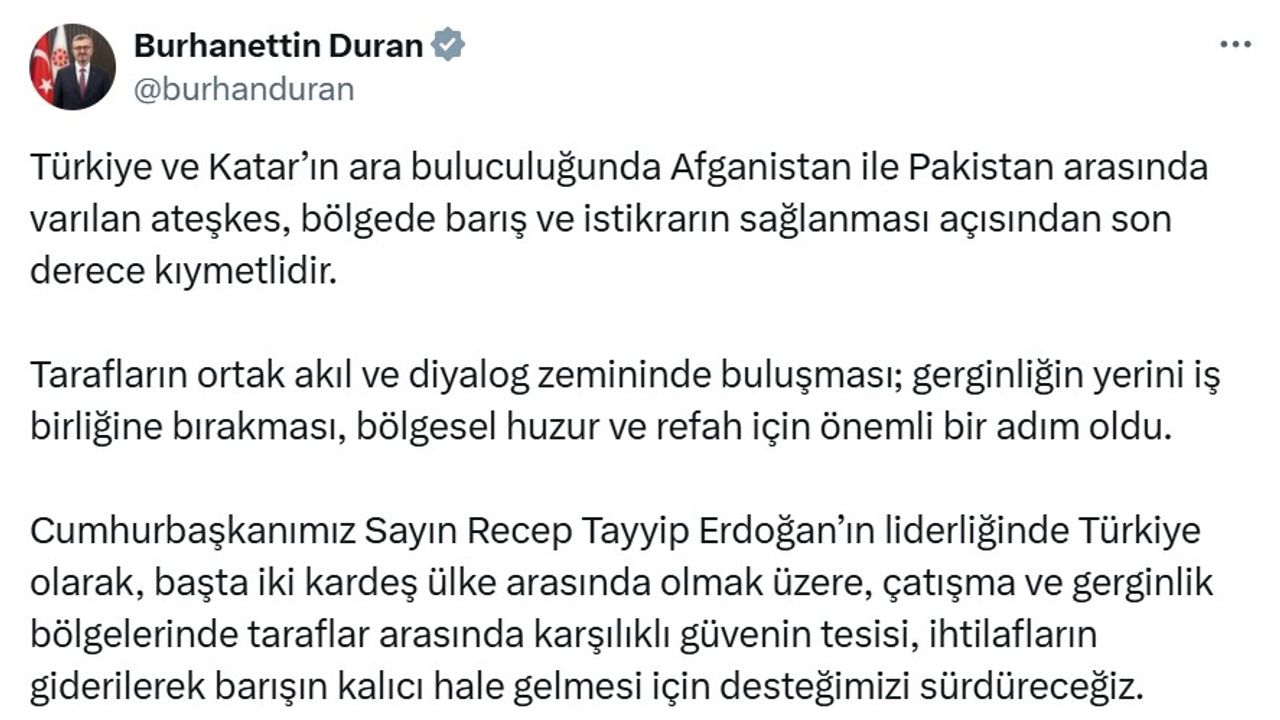 Cumhurbaşkanlığı İletişim Başkanı Burhanettin Duran, Türkiye ve Katar’ın arabuluculuğunda Afganistan ile Pakistan arasında varılan ateşkesin, bölge barışı açısından son derece kıymetli olduğunu vurguladı.
