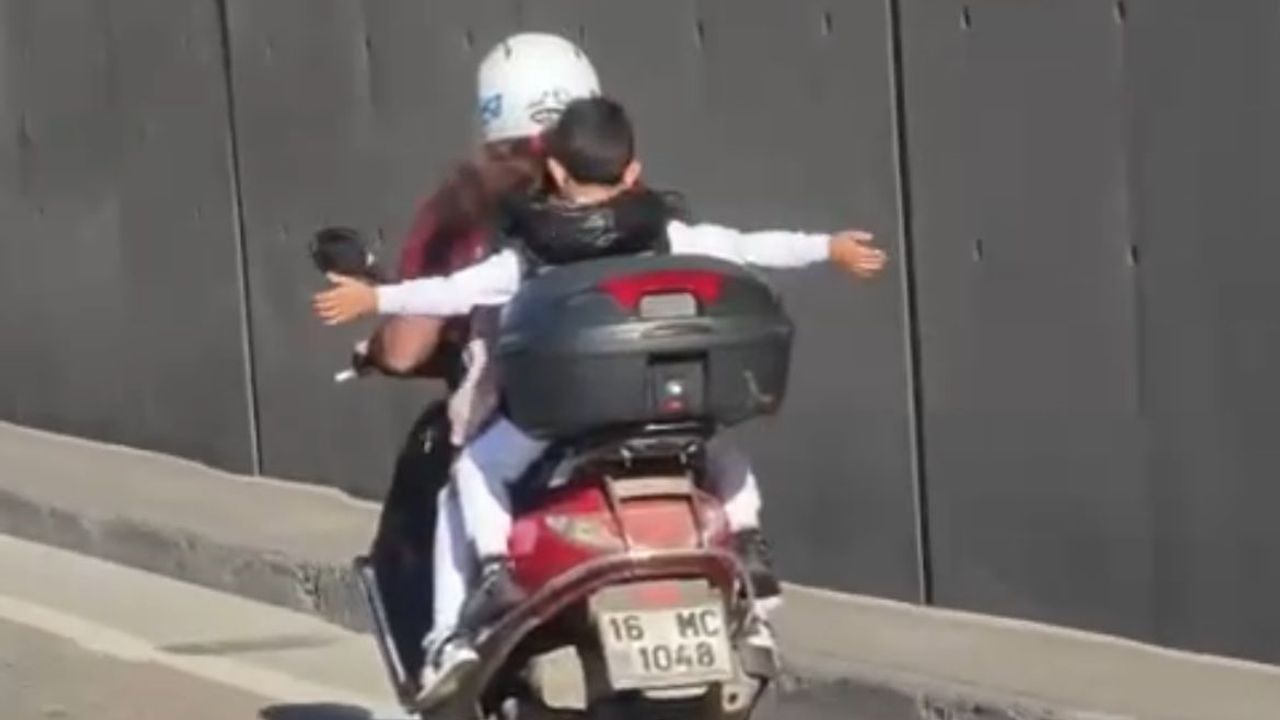 Bursa’da motosikletle trafiğe çıkan bir kişi, arkasına herhangi bir koruyucu ekipman kullanmadan aldığı iki küçük çocukla trafiğe çıkıp kilometrelerce ilerledi. Yürekleri ağza getiren görüntüler kameraya yansıdı.