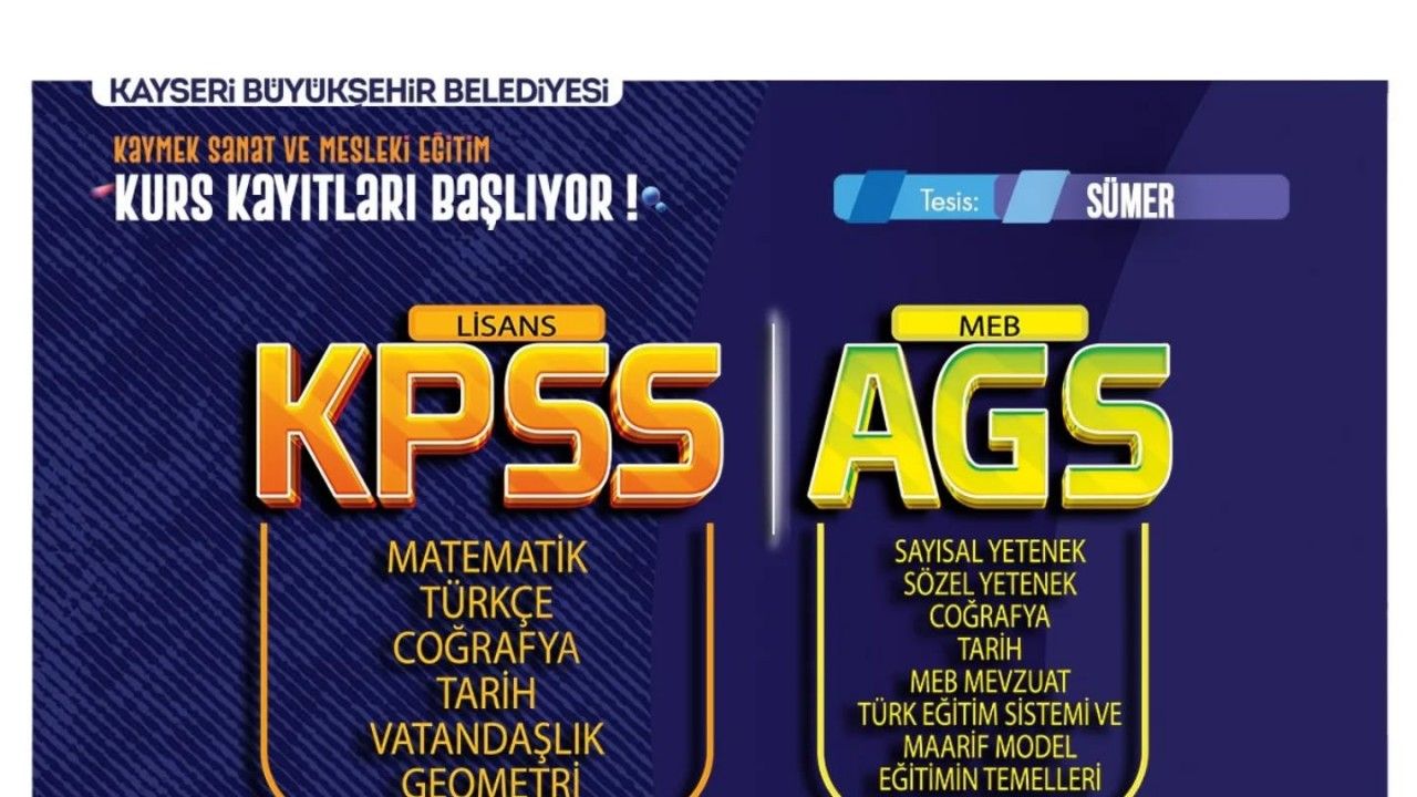 Hizmetleri ile üniversiteler şehri Kayseri’nin 6’ncı üniversitesi olarak anılan Kayseri Mesleki Eğitim ve Kültür A.Ş. (KAYMEK) 2025-2026 eğitim öğretim yılında gençlerin geleceğine ışık tutan faaliyetlerini sürdürüyor. Bu çerçevede KAYMEK tarafından, Kamu Personeli Seçme Sınavı (KPSS) Lisans ve Milli Eğitim Bakanlığı Akademi Giriş Sınavı’na (AGS) hazırlanan gençlere yönelik KPSS ile AGS kursu düzenliyor. Memur ve öğretmen adayları, KAYMEK Sümer Tesisi’nde gerçekleşecek olan tamamen ücretsiz MEB-AGS ve KPSS Lisans hazırlık kurslarına kayıt işlemlerini www.kaymekonline.com internet adresinden yapabilecek.