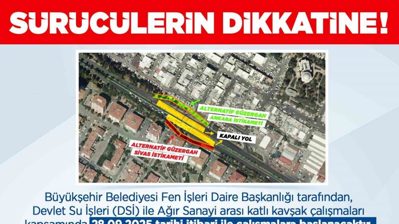 Kayseri Büyükşehir Belediyesi tarafından yapılan açıklamada, "Kayseri Büyükşehir Belediyesi Fen İşleri Daire Başkanlığı tarafından, Devlet Su İşleri (DSİ) ile Ağır Sanayi arası katlı kavşak çalışmaları kapsamında 28 Eylül 2025 tarihi itibarıyla çalışmalara başlanacaktır. Yapılacak çalışmalar doğrultusunda Ağır Sanayi Kavşağı’nın şehrin batısı ve doğusuna gidiş istikametleri servis yolları üzerinden sağlanacaktır. Sürücülerimizin belirtilen tarihten itibaren trafik işaret ve işaretçilerine uymaları ve alternatif güzergâhları kullanmaları önem arz etmektedir. Trafik akışı, çalışmalar tamamlanana kadar bu güzergâhlar üzerinden sürdürülecektir. Vatandaşlarımızın mağduriyet yaşamamaları için gerekli düzenlemeler yapılmış olup, siz değerli basın mensuplarımız aracılığıyla kamuoyunun bilgilendirilmesi büyük önem taşımaktadır" ifadelerine yer verildi.