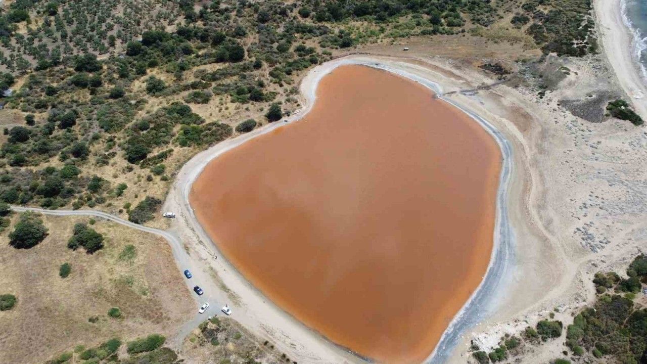 Alexandria Troas Antik Kenti’nin ticaret merkezi olarak uzun süre hizmet eden 2 bin yıllık iç limanı, günümüzde ise kalpli pembe göl olarak turizme katkı sağlıyor. Dış liman ile bağlantısı zamanla ortadan kalkan antik kentin iç limanı bir göle dönüştü. Sıcaklık ve tuzluluğun artmasından dolayı ’dunaliella salina’ adlı mikroskobik bitkisel canlının fazla üremesinden kaynaklı yaşanan pembe ve kırmızıya yakın tonlar, göle farklı bir görünüm kazandırıyor. Zamanla da doğa şartlarına bağlı olarak suyun çekilmesi ile kalp şeklini aldı. İçerisindeki tuzlu suyun yılın belli dönemlerinde pembe renge bürünmesiyle 2 bin yıllık antik liman, dünya üzerinde bilinen ve pembe renge sahip 8 gölden birisi haline geldi. Ziyaretçilerin çekip, sosyal medyada paylaştığı fotoğraflarla popülerliği artan kalp şeklindeki gölün suyu, bugünlerde yine pembeye çalmaya başladı. Pembeye bürünen ve kalp şekli ile dikkati çeken ’Kalpli Göl’, dron ile havadan görüntülendi.