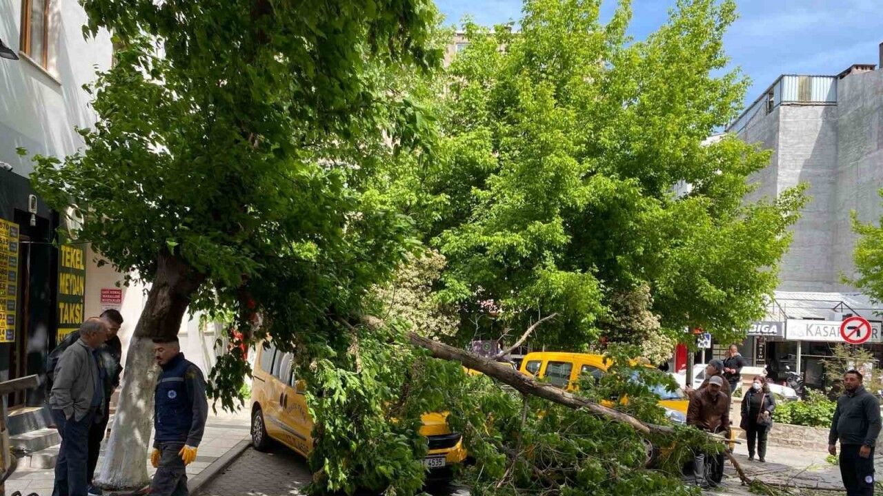 Çanakkale’de fırtınada kırılan ağaç dalı taksi durağında park halindeki 3 taksinin üzerine düştü. Olayda şans eseri yaralanan olmazken, araçlarda maddi hasar oluştu.