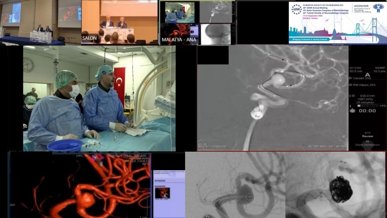 Toplantı kapsamında, İnönü Üniversitesi Turgut Özal Tıp Merkezi Girişimsel Nöroradyoloji Ünitesi’nden Prof. Dr. İsmail Okan Yıldırım ve Doç. Dr. Ahmet Turan Kaya öncülüğündeki ekip, beyin damarlarında oluşan baloncukların (anevrizma) kapalı yöntemle tedavisini canlı yayında gerçekleştirdi. Ameliyata Beyin ve Sinir Cerrahisi Anabilim Dalı’ndan Doç. Dr. Bora Tetik de eşlik etti. Zorlu operasyon, dünyanın dört bir yanından gelen bilim insanları tarafından anbean takip edildi.