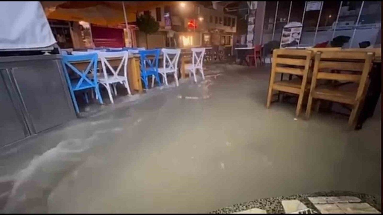 İzmir’in gözde tatil merkezi Çeşme, gece saatlerinde şiddetli yağışa teslim oldu. Yağmur suları sele dönüşürken, ilçe merkezinde cadde ve sokaklar göle döndü.