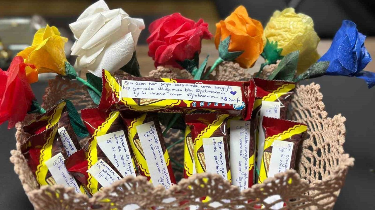 Osmaniye'nin Toprakkale ilçesinde öğrenciler, öğretmenlerine çikolata ve çiçekler üzerine yazdıkları küçük notlarla sürpriz hazırladı.
