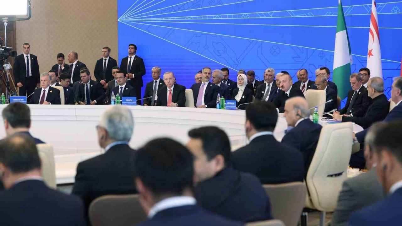 Türkiye olarak 2053 yılı için net sıfır emisyona ulaşma ve yeşil kalkınma vizyonlarını gerçekleştirme yolunda kilit sektörlerini geliştirmeye devam ettiklerini belirten Erdoğan, "Bilhassa enerji alanında yenilikçi girişimlerimizle yenilenebilir enerjinin toplam kurulu güç içerisindeki payını yüzde 59’a çıkardık. Bu oranla Avrupa’da 5’inci dünyada 11. sıraya yükseldik.2024, 2030 yıllarını kapsayan Ulusal Enerji Verimliliği Eylem Planımızla 100 milyon ton karbondioksit eş değeri emisyon azaltımı öngörüyoruz. İklim kanunumuz önceki gün meclisimizde kabul edildi. Eşim Emine Erdoğan’ın himayesinde küresel düzeye taşınan sıfır atık projesi iklim değişikliğiyle mücadelemize ilave güç katıyor. Projenin başlangıcından bu yana yaklaşık 6 milyon ton sera gazı emisyonunun önüne geçtik. Birleşmiş Milletler İklim Değişikliği 31. Taraflar Konferansı (COP) ev sahipliğimiz onaylandığında gelişmiş ve gelişmekte olan ülkeler arasında adil, sürdürülebilir, şeffaf ve kapsayıcı bir yaklaşımı hakim kılmanın gayreti içerisinde olacağız. Türkiye güçlü tecrübesini ve en iyi uygulama örneklerini teşkilatımızla paylaşmaya hazırdır. Bu vesileyle Azerbaycan’da teşkil edilecek temiz enerji ve araştırma merkezleri kurucu belgelerinin onay sürecinin ülkemizde son aşamada olduğunu da sizlerle paylaşmak istiyorum. Teşkilatımızın başlıca işbirliği alanı olan ekonomi ve ticarette vizyonumuzu daha da geliştirmek mecburiyetindeyiz. 100 milyar dolarlık bölgesel ticaret hacmi hedefimizi daha yüksek rakamlara taşıyacak adımları hep birlikte atmalıyız" ifadelerini kullandı.