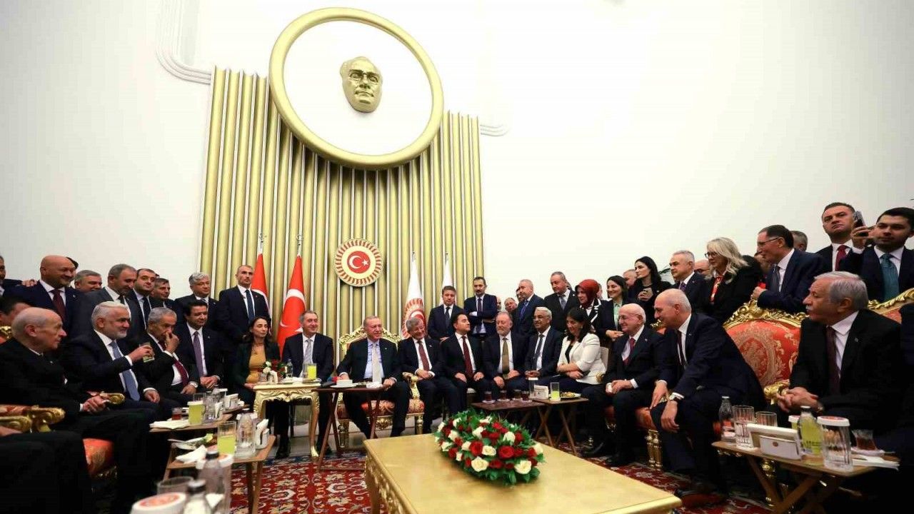 TBMM Başkanı Numan Kurtulmuş ev sahipliğinde TBMM’de yasama yılı açılışı dolayısıyla resepsiyon düzenlendi. Resepsiyonda mermerli salonda liderler zirvesi düzenlendi. Zirveye Cumhurbaşkanı Erdoğan, TBMM Başkanı Numan Kurtulmuş, MHP Genel Başkanı Devlet Bahçeli, TBMM Başkanvekili Celal Adan, DEM Parti Eş Genel Başkanları Tülay Hatımoğulları ve Tuncer Bakırhan, TBMM Başkanvekili Pervin Buldan, DEM Parti İmralı heyeti üyesi Grup Başkanı Mithat Sancar, DEVA Genel Başkanı Ali Babacan, Gelecek Partisi Genel Başkanı Ahmet Davutoğlu, Saadet Partisi Genel Başkanı Mahmut Aslan, HÜDAPAR Genel Başkanı Zekeriya Yapıcıoğlu, eski TBMM başkanları katıldı.