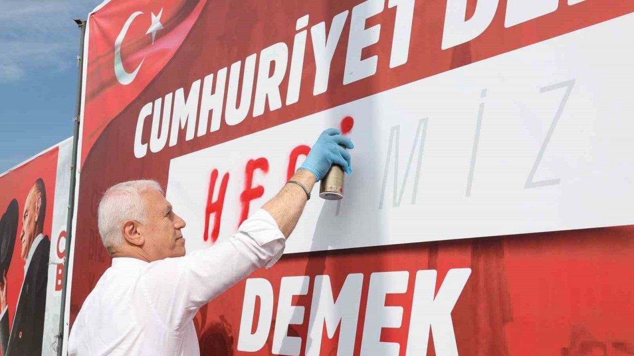 Kampanyaya ‘Cumhuriyet demek, hepimiz demek’ diyerek katılan Bursa Büyükşehir Belediye Başkanı Mustafa Bozbey de sloganını billboarda sprey boyayla yazdı. 29 Ekim’de Cumhuriyet Bayramı coşkusunu yaşamak için tüm Bursalıları alanlara davet eden Başkan Mustafa Bozbey, "Cumhuriyet demek, hepimiz demek. Cumhuriyet demek, aydınlanma demek. Cumhuriyet demek, bağımsızlık demek. Cumhuriyet demek, vatan demek. Cumhuriyet demek, Atatürk demek. Onun için Cumhuriyete sahip çıkmak hepimizin sorumluluğudur. Hep birlikte en büyük bayramımızı kutlayalım. Cumhuriyeti gelecek kuşaklara hep birlikte taşıyalım" dedi.