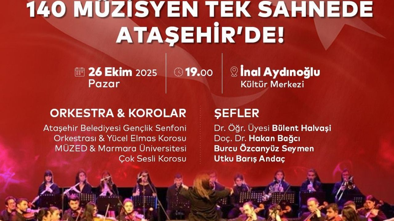 Ataşehir Belediyesi Gençlik Senfoni Orkestrası, Yücel Elmas Korosu MÜZED ve Marmara Üniversitesi Çoksesli Korosu’nun gerçekleştireceği Cumhuriyet Bayramı konserinde 140 müzisyen aynı sahnede buluşacak.