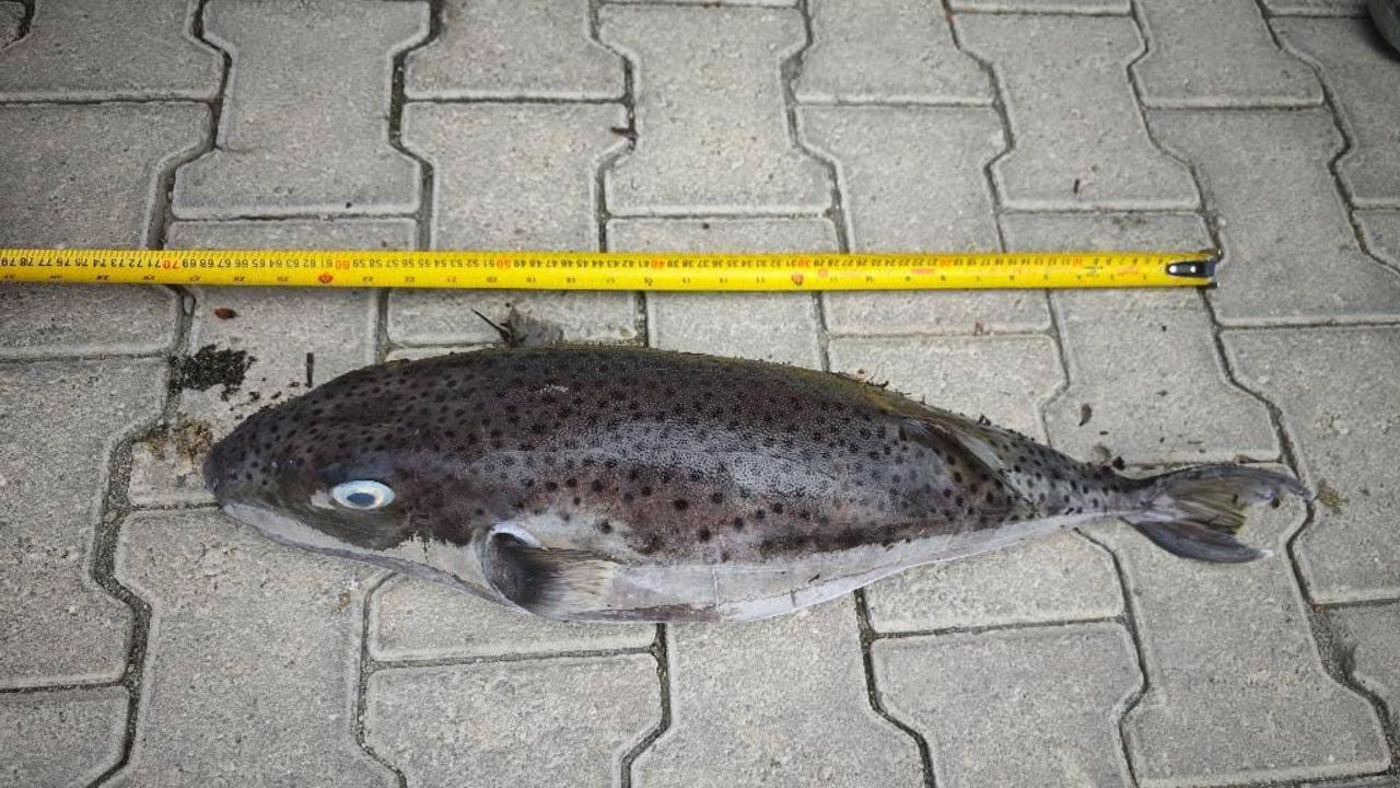 Muğla’nın Datça ilçesinde 68 santimetre boyundaki balon balığı, karaya vurmuş halde bulundu.