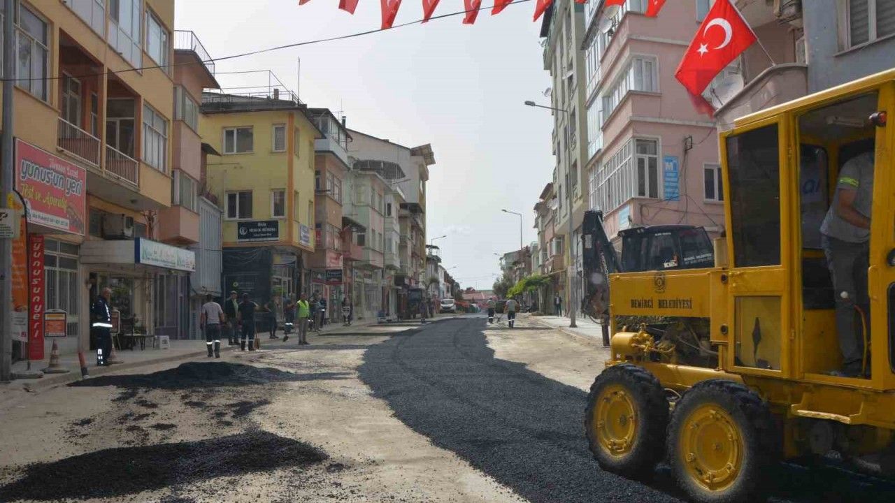 Manisa’nın Demirci ilçesinde altyapı sebebiyle bozulan ana cadde yolları ilçe belediyesince sıcak asfalt yapılıyor.