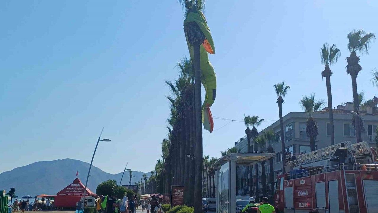 Muğla’nın Marmaris ilçesinde deniz paraşütü palmiye ağacına takılırken, ağaçta asılı kalan iki kişi çevredeki vatandaşların yardımıyla kurtarıldı.