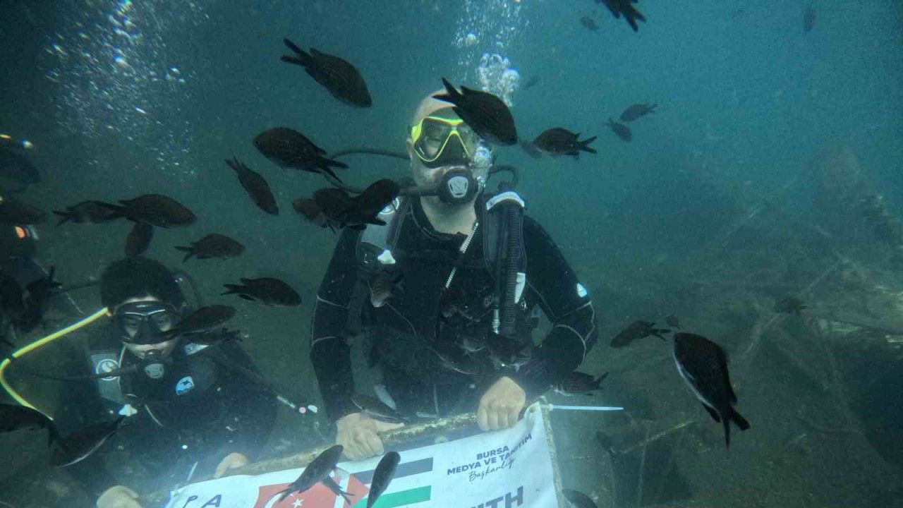 Bursa’da şehit ve gazi yakını bir grup dalış gerçekleştirdikleri deniz altından İsrail zulmü altındaki Filistin halkı ve Gazze yolunda ilerleyen Küresel Sumud filosuna destek verdi.