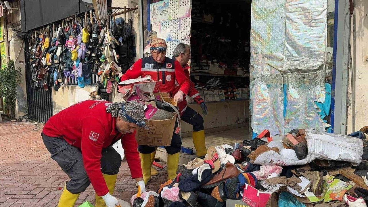 Denizle karanın birleştiği Hatay’ın İskenderun ilçesinde su basan iş yerlerinde temizlik çalışmaları gönüllü AFAD üyelerinin de desteği ile devam ediyor.