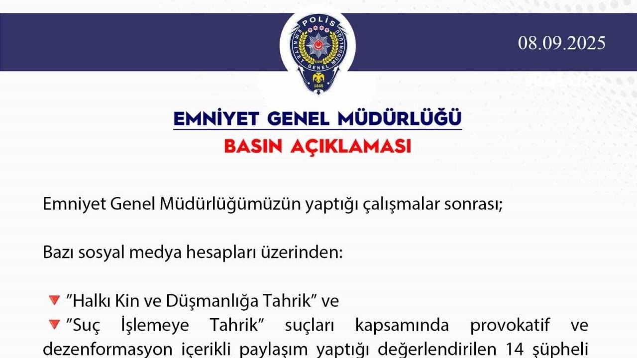 Emniyet Genel Müdürlüğü tarafından, provokatif ve dezenformasyon içerikli paylaşım yaptığı değerlendirilen 14 şüpheli hesap yöneticisi hakkında işlem başlatıldığı açıklandı.