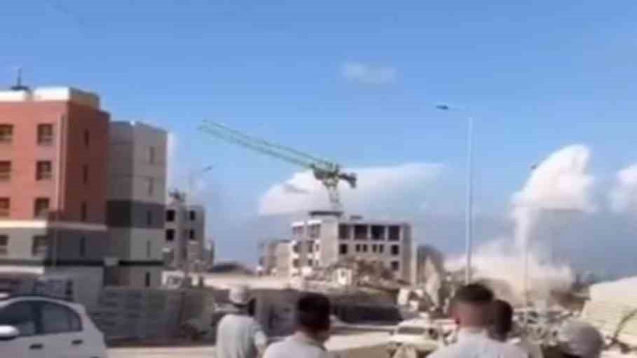 Hatay’da temel açma çalışmaları sırasında patlatılan dinamit kule vinci sarsarak yıktı, o anlar kameraya yansıdı.