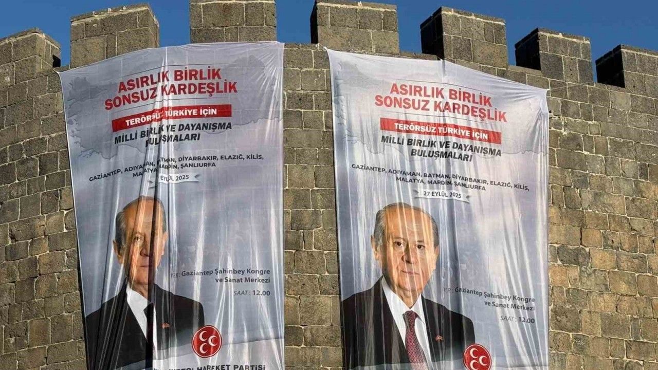 Diyarbakır surları, MHP Genel Başkanı Devlet Bahçeli’nin posterleri ile donatıldı. Dağkapı Meydanı’nda bulunan Dağkapı surlarına asılan dev afişlerle vatandaşlar, Gaziantep’teki programlara davet edildi. Afişte, ’’Asırlık birlik sonsuz kardeşlik. Terörsüz Türkiye için milli birlik ve dayanışma buluşmaları. Gaziantep, Adıyaman, Batman, Diyarbakır, Elazığ, Kilis, Malatya, Mardin, Şanlıurfa’’ ifadelerine yer verildi.