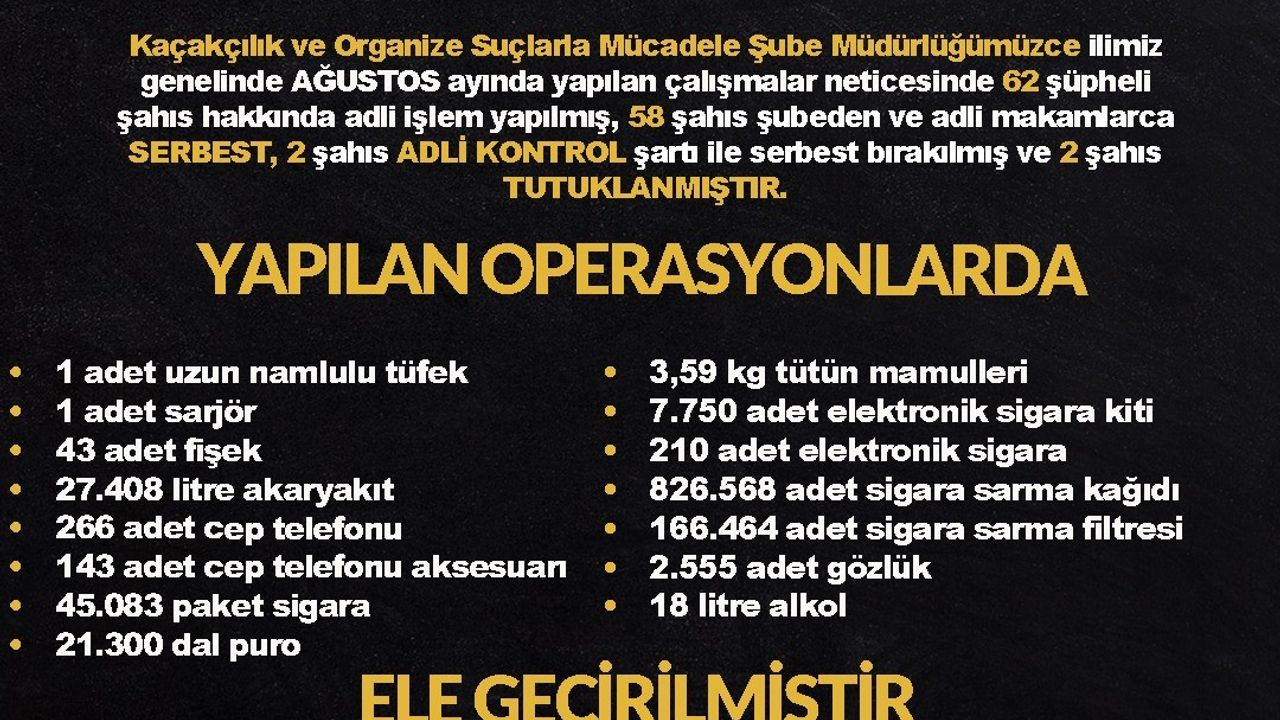 Diyarbakır Emniyet Müdürlüğü Kaçakçılık ve Organize Suçlarla Mücadele Şube Müdürlüğünce, il genelinde 1-31 Ağustos tarihlerinde yapılan operasyonlarda 62 şüpheli şahıs hakkında adli işlem yapıldı. 58 şahıs şubeden ve adli makamlarca, 2 şahıs ise adli kontrol şartı ile serbest bırakılırken 2 şahıs tutuklanarak cezaevine gönderildi. Yapılan aramalarda 1 adet uzun namlulu tüfek, 43 adet fişek, 1 adet şarjör, 45 bin 83 paket sigara, 266 adet cep telefonu, 143 adet cep telefonu aksesuarı, 18 litre alkol, 21 bin 300 dal puro, 27 bin 408 litre akaryakıt, 2 bin 555 adet gözlük, 3,59 kilogram tütün mamulleri, 7 bin 750 adet elektronik sigara kiti, 210 adet elektronik sigara, 826 bin 568 adet sigara sarma kağıdı, 166 bin 464 sigara sarma filtresi ele geçirildi.