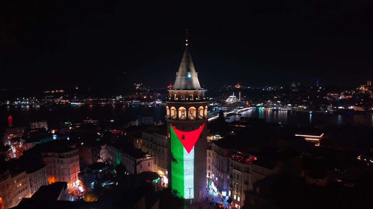 İnsanlık dışı şartlarda yaşamaya çalışan ve İsrail tarafından soykırıma uğrayan Filistin’e destek amacıyla 15 Temmuz şehitler Köprüsü’ne Filistin bayrağı asılıp, Galata Kulesi’ne bayrağın görüntüsü yansıtıldı.
