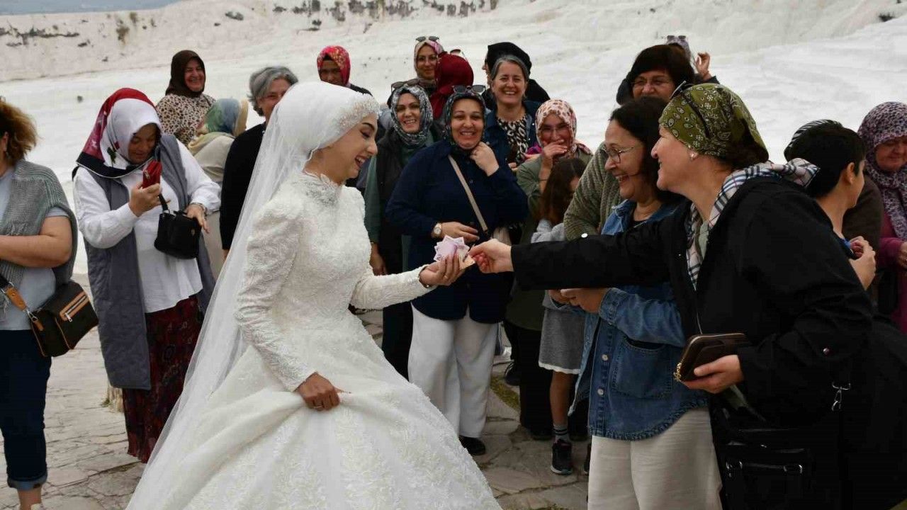 Denizli’de geçen yıl evlenen çift, düğün fotoğraflarını beğenmeyince Pamukkale travertenlerinde yeniden düğün çekimi planladı. Travertenlerde fotoğraf çekimi yaptıran çiftle sohbet eden turistlerin takı takmaları unutulmaz anlar yaşattı.