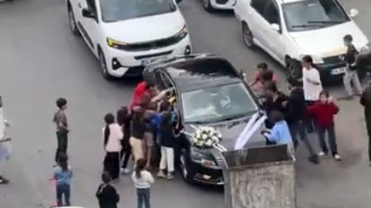 İstanbul Esenyurt’ta çocuklar, gelin ve damattan zarf almak için düğün konvoyunun önünü çöp konteyneri ile kesti. O anlar kameraya yansıdı.