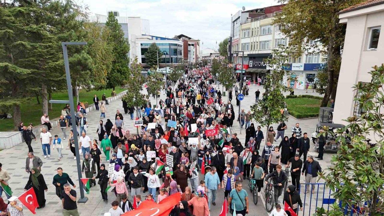 Düzce’de yüzlerce kişi Filistin’e destek vermek için bir araya geldi. Filistin bayrakları ile yürüyüş yapan Düzceliler Sumud Filosu’na da destek verdi.