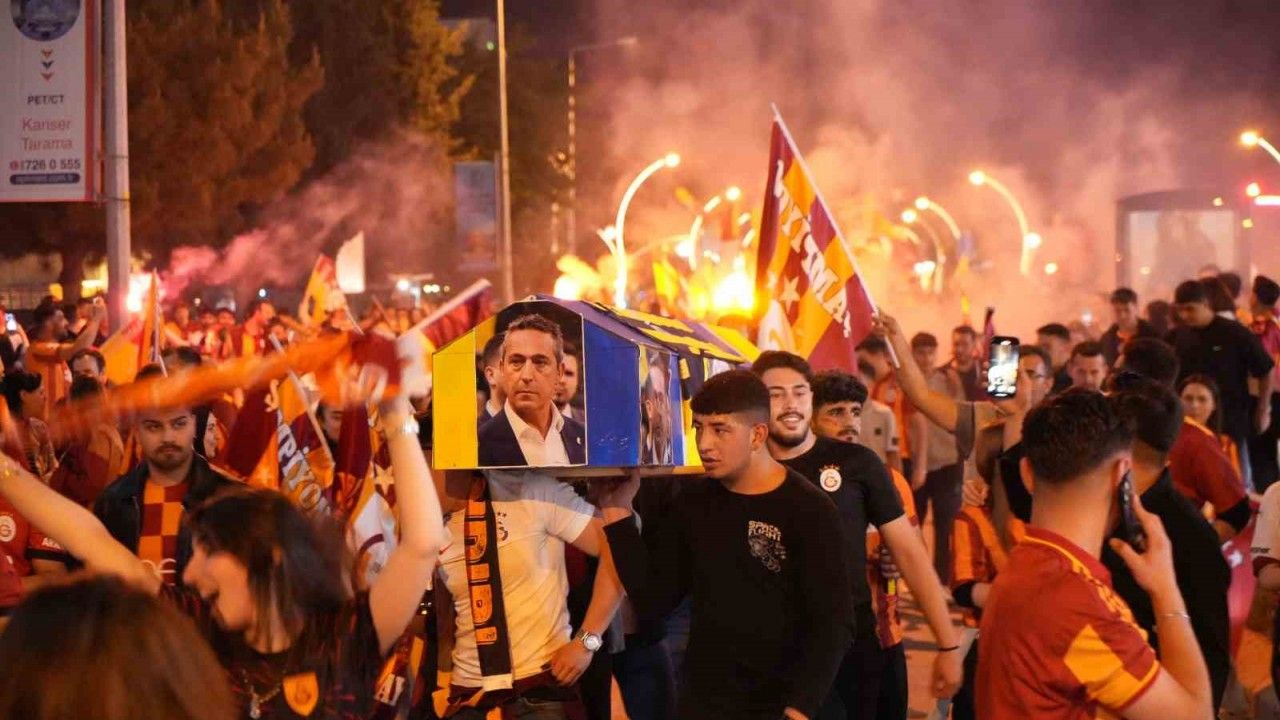 Süper Lig’in 36. haftasında 25. şampiyonluğunu ilan eden Galatasaraylı taraftarlar maç bitiminde maket tabut ve bir aracın arkasına bağladıkları fiber tekne ile kutlama yaptı.