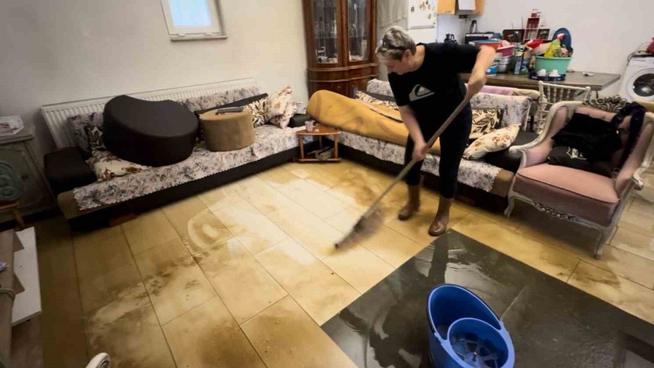 Edirne’de şiddetli sağanak nedeniyle rögarın taşması sonucu su basan evdeki eşyalar kullanılamaz hale geldi.