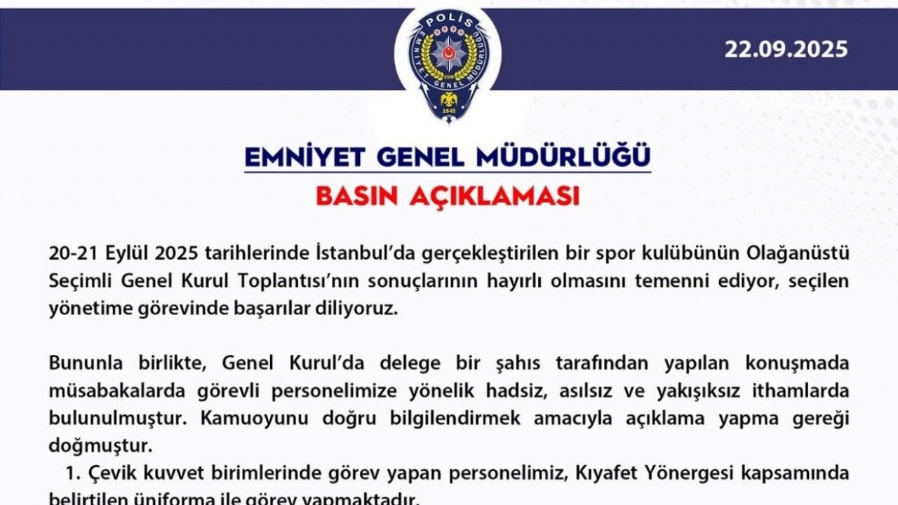 "20-21 Eylül 2025 tarihlerinde İstanbul’da gerçekleşen bir spor kulübünün Olağanüstü Seçimli Genel Kurul Toplantısı’nın sonuçlarının hayırlı olmasını temenni ediyor, seçilen yönetime görevinde başarılar diliyoruz. Bununla birlikte, Genel Kurul’da delege bir şahıs tarafından yapılan konuşmada müsabakalarda görevli personelimize yönelik hadsiz, asılsız ve yakışıksız ithamlarda bulunulmuştur. Kamuoyunu doğru bilgilendirmek amacıyla açıklama yapma gereği doğmuştur. Çevik kuvvet birimlerinde görev yapan personelimiz, Kıyafet Yönergesi kapsamında belirtilen üniforma ile görev yapmaktadır. Müsabakaların risk durumu ve güvenlik ihtiyaçları doğrultusunda personel sayısı planlamakta olup, 40-45 bin personel görevlendirildiği iddiası gerçeği yansıtmamaktadır. Türk Polis Teşkilatı, Türkiye Cumhuriyeti Anayasası, Polis Vazife ve Salahiyet Kanunu ile Emniyet Teşkilatı Kanunu çerçevesinde görev yapmaktadır. Mevzuat hükümleri dışında hiç kimsenin, hangi sıfatla olursa olsun, Türk Polis Teşkilatı üzerinde denetim yapması mümkün değildir. İlgili şahıs hakkında suç duyurusunda bulunulmuştur."
