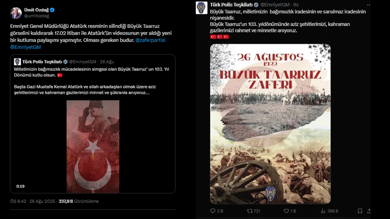 Özdağ, sosyal medya platformu X üzerinden yaptığı açıklamada, "Emniyet Genel Müdürlüğü Atatürk resminin silindiği Büyük Taarruz görselini kaldırarak 17.02 itibarı ile Atatürk’ün videosunun yer aldığı yeni bir kutlama paylaşımı yapmıştır. Olması gereken budur." ifadelerini kullandı.