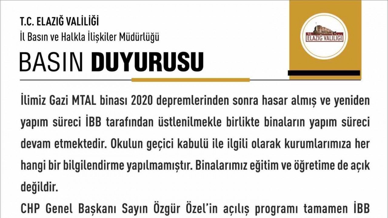 Açılış sonrası Elazığ Valiliği’nce yapılan açıklamada, "İlimiz Gazi MTAL binası 2020 depremlerinden sonra hasar almış ve yeniden yapım süreci İBB tarafından üstlenilmekle birlikte binaların yapım süreci devam etmektedir. Okulun geçici kabulü ile ilgili olarak kurumlarımıza herhangi bir bilgilendirme yapılmamıştır. Binalarımız eğitim ve öğretime de açık değildir. CHP Genel Başkanı Sayın Özgür Özel’in açılış programı tamamen İBB tarafından, Valiliğimiz ve İl Milli Eğitim Müdürlüğümüz ile hiçbir ön görüşmede bulunulmadan gerçekleştirilmiştir. Devlet teamüllerinde ilde yapılacak programların gerçekleştirilmesinin usul ve esasları bellidir" denildi.