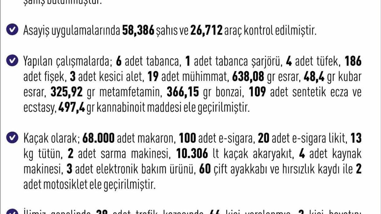 Yapılan çalışmalarda; 6 adet tabanca, 1 adet tabanca şarjörü, 4 adet tüfek, 186 adet fişek, 3 adet kesici alet, 19 adet mühimmat, 638,08 gram esrar, 48,4 gram kubar esrar, 325,92 gram metamfetamin, 366,15 gram bonzai, 109 adet sentetik ecza ve ecstasy, 497,4 gram kannabinoit maddesi, kaçak olarak; 68 bin adet makaron, 100 adet e-sigara, 20 adet e-sigara likit, 13 kilo tütün, 2 adet sarma makinesi, 10.306 litre kaçak akaryakıt, 4 adet kaynak makinesi, 3 adet elektronik bakım ürünü, 60 çift ayakkabı ve hırsızlık kaydı ile 2 adet motosiklet ele geçirildiği bildirildi.