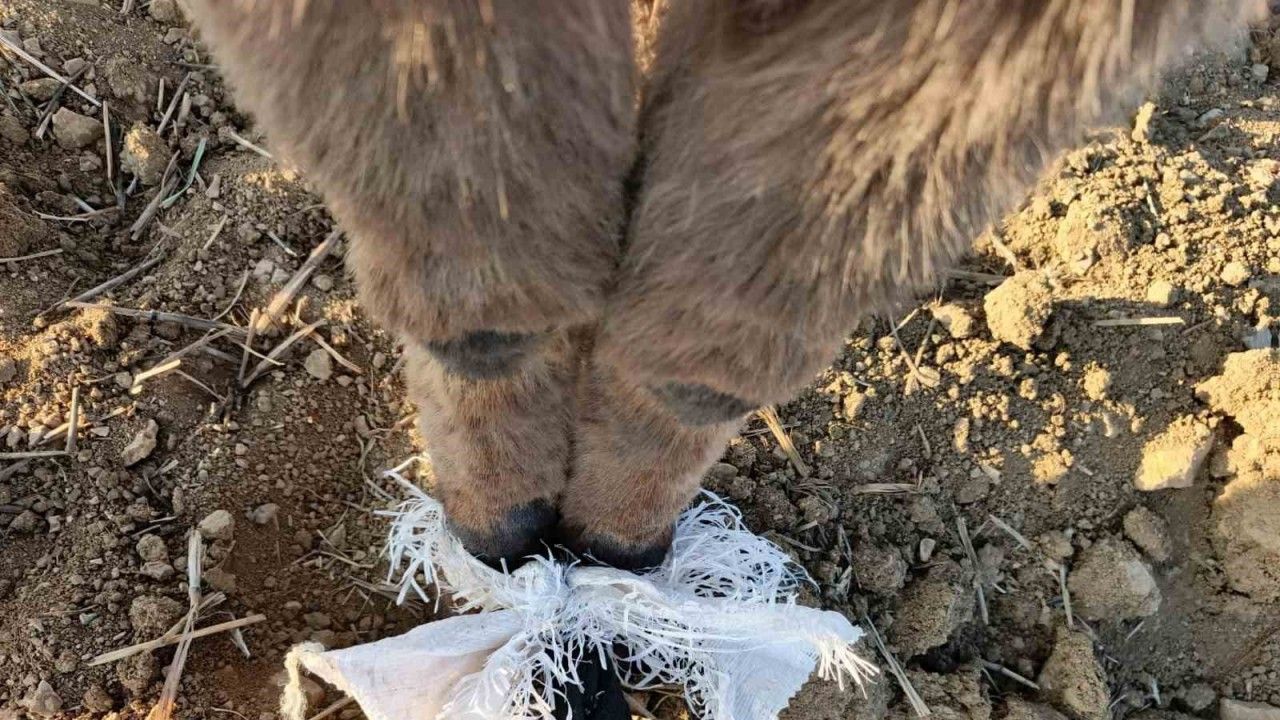Ankara’nın Elmadağ ilçesinde, sürüsünü otlatan bir çoban, tarlada ayakları bağlı, kafasına çuval geçirilmiş halde bulduğu eşeği kurtardı.
