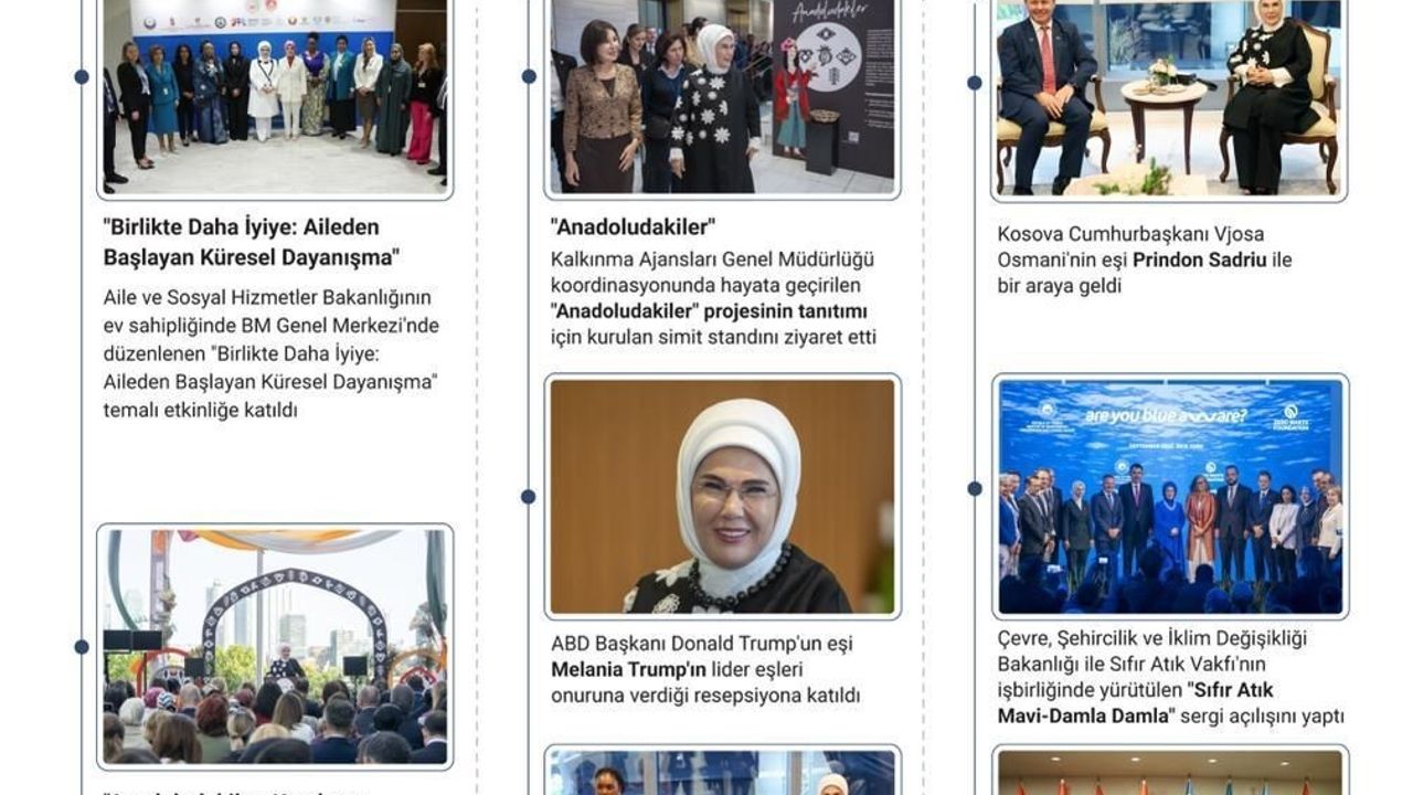 Cumhurbaşkanı Recep Tayyip Erdoğan’ın eşi, Birleşmiş Milletler (BM) Sıfır Atık Yüksek Düzeyli Şahsiyetler Danışma Kurulu Başkanı Emine Erdoğan, New York’ta "Anadolu kültürü", "Sıfır Atık Mavi", "aile", "çevre" ve "sağlık" temalı etkinliklerde lider eşleriyle bir araya geldi.
