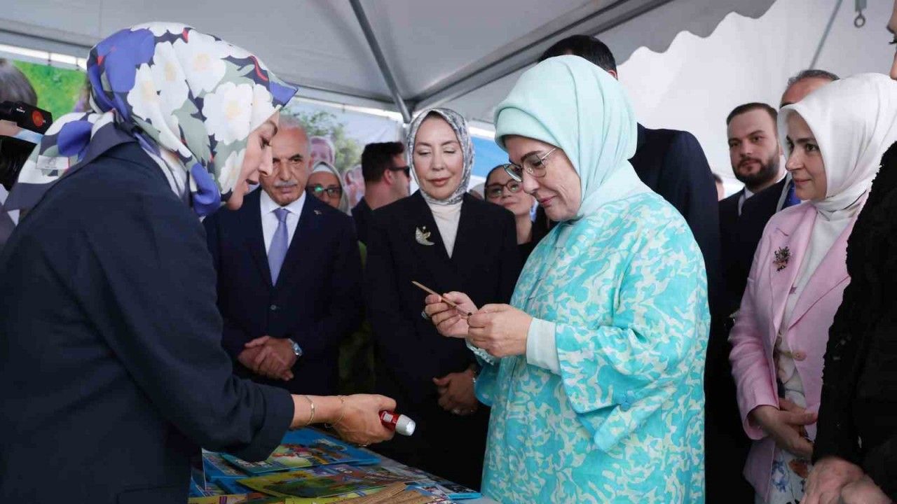 Çocuklara sıfır atık farkındalığının önemi hakkında bilgi veren Emine Erdoğan, çocukların geri dönüşüm hakkında kendisine anlattıklarını ilgiyle dinledi. Erdoğan, geleneksel el sanatları ve doğal malzemelerle üretilen ürünlerin tanıtıldığı stantları ziyaret ederek, görevlilerden doğayı korumak için bulunan çözümlere ilişkin bilgi aldı. Takı tasarım atölyesinde bir araya geldiği çocukları sevgiyle selamlayan Emine Erdoğan’ı, çocuklar da alkışlarla uğurladı.