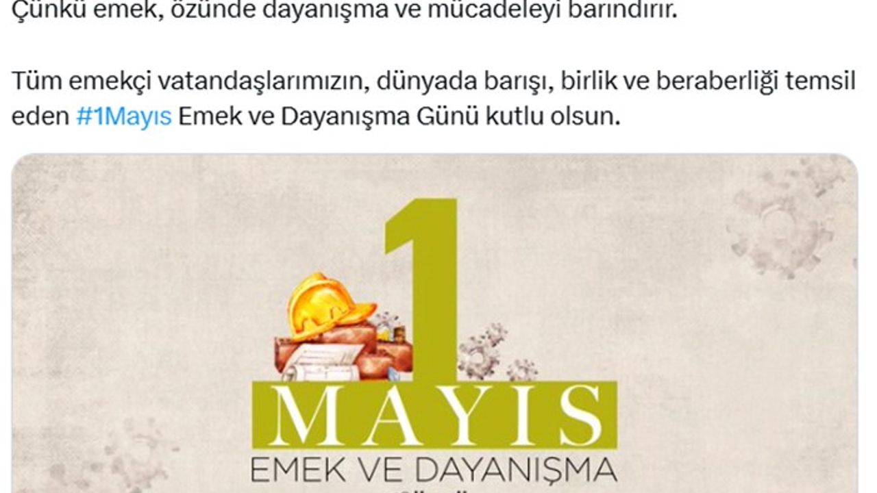 "Ülkemizin istikbali için dökülen her alın teri çok onurlu, çok kıymetlidir. Çünkü emek, özünde dayanışma ve mücadeleyi barındırır. Tüm emekçi vatandaşlarımızın, dünyada barışı, birlik ve beraberliği temsil eden 1 Mayıs Emek ve Dayanışma Günü kutlu olsun."