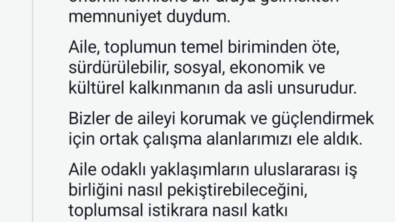 "Bizler de aileyi korumak ve güçlendirmek için ortak çalışma alanlarımızı ele aldık. Aile odaklı yaklaşımların uluslararası işbirliğini nasıl pekiştirebileceğini, toplumsal istikrara nasıl katkı sunabileceğini ve yerelden küresele dönüştürücü bir güç olarak nasıl rol oynayabileceğini değerlendirdik. Zira biliyoruz ki aile, değerlerin taşıyıcısı, çocuklarımız için en güvenli sığınak ve insanlığın yarınıdır. Krizlerin, çatışmaların ve afetlerin gölgesinde bize yol gösteren hakikat, dayanışmanın aileden başladığıdır. Türkiye olarak, barışa, adalete ve ortak refaha giden yolun aileden geçtiğine inanıyoruz. Öyle ki aileyi koruyabildiğimiz ölçüde, daha adil, daha huzurlu ve daha müreffeh bir dünya inşa edebiliriz. Bu doğrultuda belirtilen her görüş ve önerinin, aile kurumunu koruma yolunda, küresel ölçekte atılacak adımlara ilham olacağına yürekten inanıyorum."