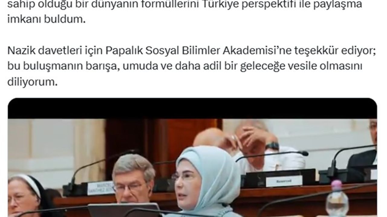 Cumhurbaşkanı Recep Tayyip Erdoğan’ın eşi Emine Erdoğan, Vatikan’da katıldığı "Kardeşlik Temelli Ekonomi: Etik Çok Taraflılık" başlığıyla düzenlenen konferansa ilişkin paylaşımda bulundu.