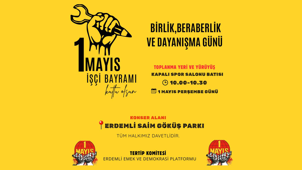 1 Mayıs Perşembe günü saat 10.00'da Kapalı Spor Salonu Batısı'nda başlayacak olan yürüyüşün ardından, saat 11.00'da Erdemli'nin merkezi noktalarından biri olan Saim Göküş Parkı'nda bir konser düzenlenecek. CHP Erdemli İlçe Başkanlığı, tüm Erdemli halkını bu birlik ve dayanışma gününde yanlarında olmaya çağırdı.