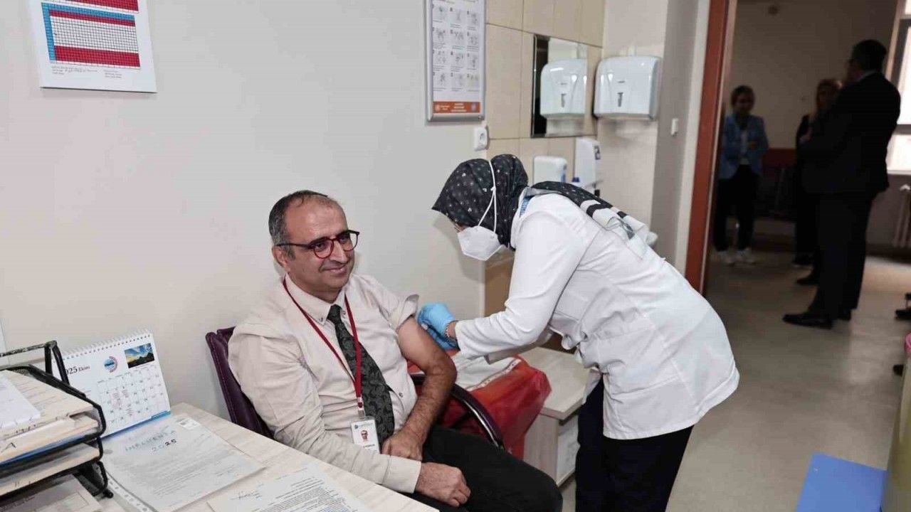 ERÜ Tıp Fakültesi Dekanı Prof. Dr. İsmail Dursun ile Hastaneler Başhekimi Prof. Dr. İbrahim Halil Kafadar ve hastane yöneticileri, personel aşı polikliniğine gelerek mevsimsel grip aşılarını yaptırdı.