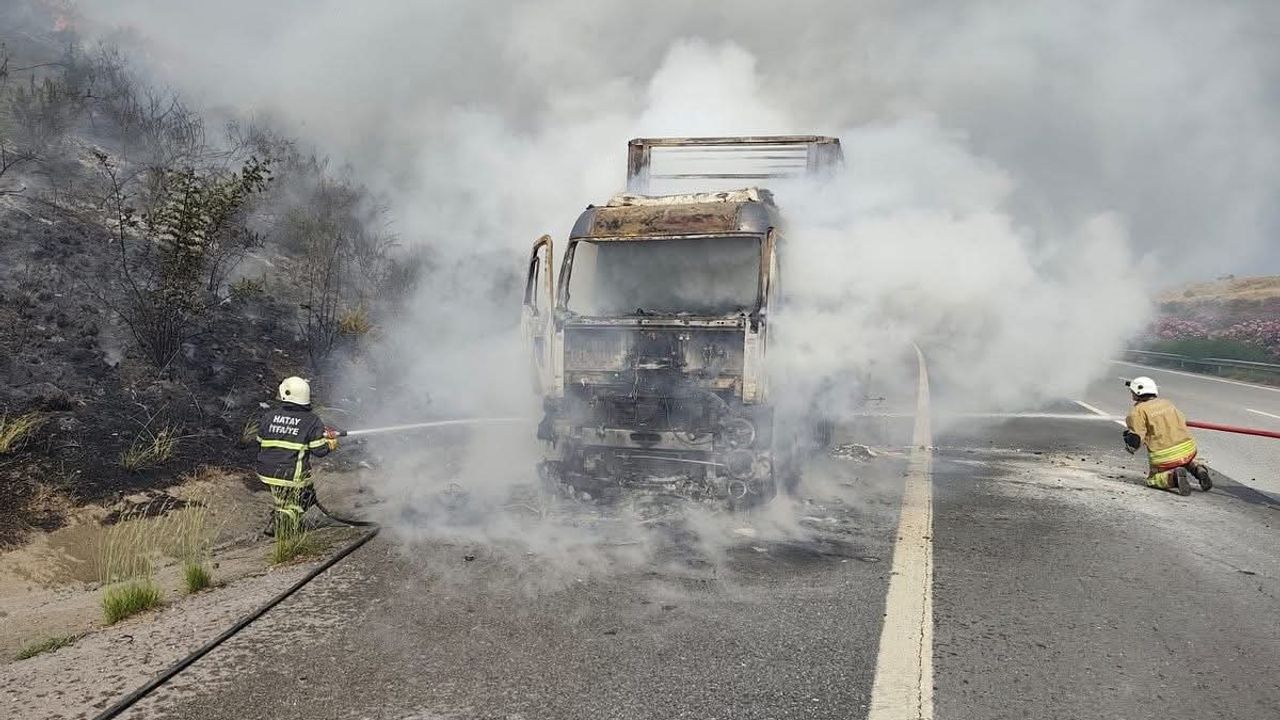 Hatay’da seyir halindeyken alevlere teslim olan tır yanarak kullanılmaz hale geldi.