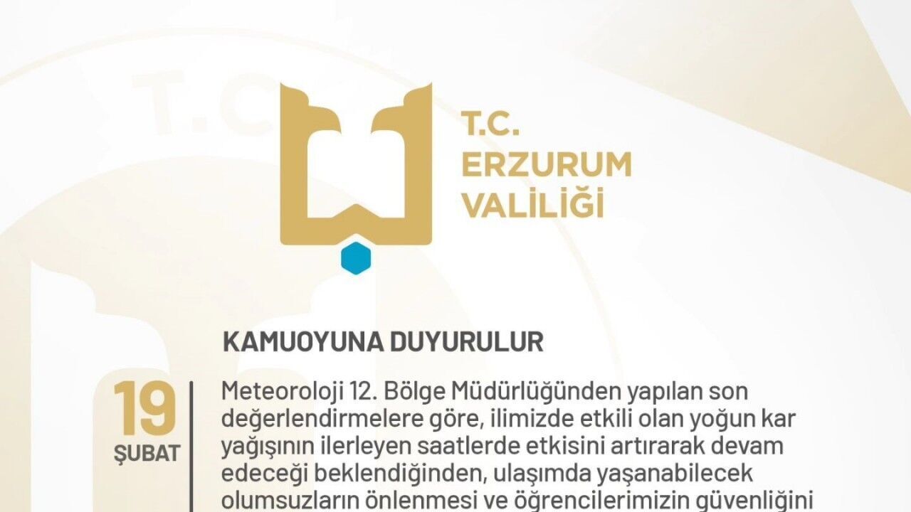 Erzurum Valiliği tarafından yapılan açıklamada, "Meteoroloji 12. Bölge Müdürlüğünden yapılan son değerlendirmelere göre, İlimizde etkili olan yoğun kar yağışının ilerleyen saatlerde etkisini artırarak devam edeceği beklendiğinden, ulaşımda yaşanabilecek olumsuzların önlenmesi ve öğrencilerimizin güvenliğini sağlamak amacıyla Aziziye, Palandöken ve Yakutiye ilçelerindeki tüm eğitim kurumlarında (anaokulu, ilkokul, ortaokul ve liselerde), 20 Şubat 2025 Perşembe günü eğitim-öğretime 1 (bir) gün süreyle ara verilmiştir. Ayrıca, belirtilen ilçelerdeki kamu kurumlarında görev yapan hamile ve engelli personel de aynı tarihte idari izinli sayılacaktır" denildi.