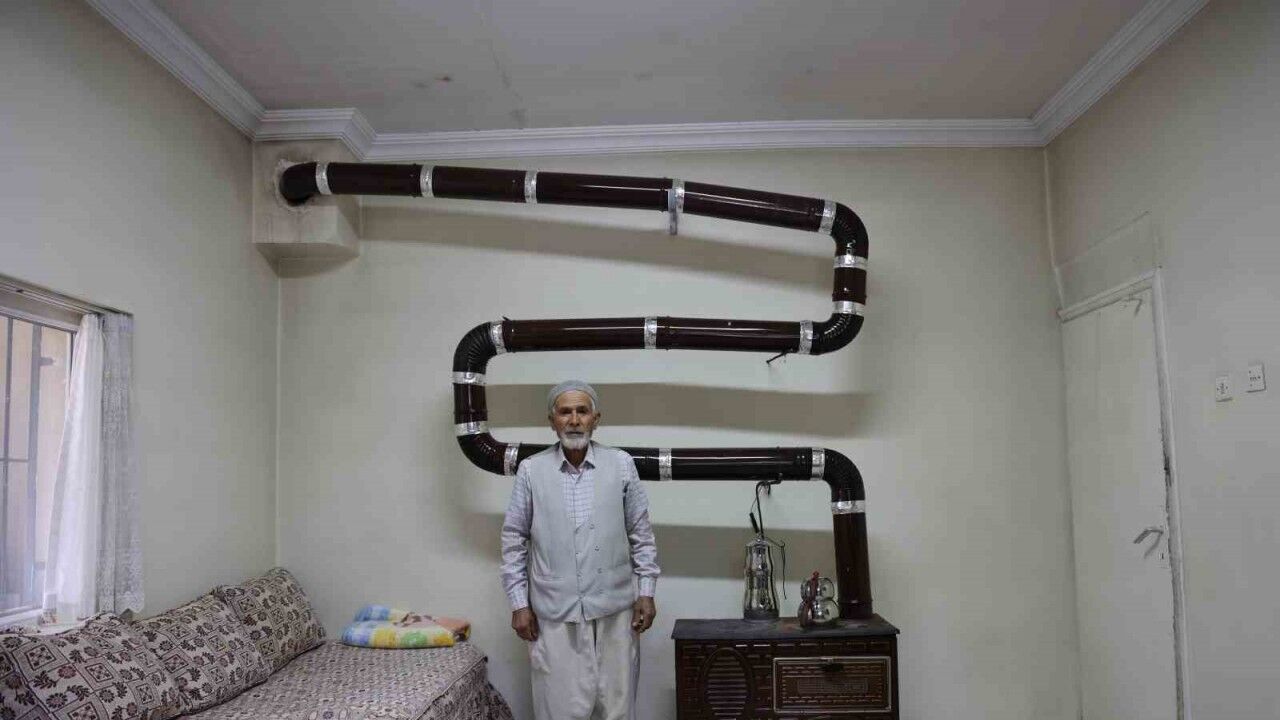 İnce, “Hava soğudu ve biz de yaşlandığımız için soğuk havalara dayanamıyoruz. Sobayı kurmadan kendi kafamdan duvarda çizgi çizdim. Gidip 700 liraya soba ve borularını aldım. Bu şekilde kurdum görenler de beğeniyor. Bir oda var ve odanın tamamı normal ısıda. Hanımın ayakları üşüyordu dayanamıyordu soğuğa onun için ben de böyle yaparsam ayakları soba borularına yakın olur düşüncesiyle üşümeyeceğini tahmin ettim ve soba borusunu bu şekilde taktım. Kendisi de ’eline sağlık çok güzel oldu’ diyor. Gelen misafirlerin de hoşuna gidiyor, ‘biz de yapalım’ diyenler var. Kömür, odun her şey yanıyor bacada tütme olmuyor” diye konuştu.
