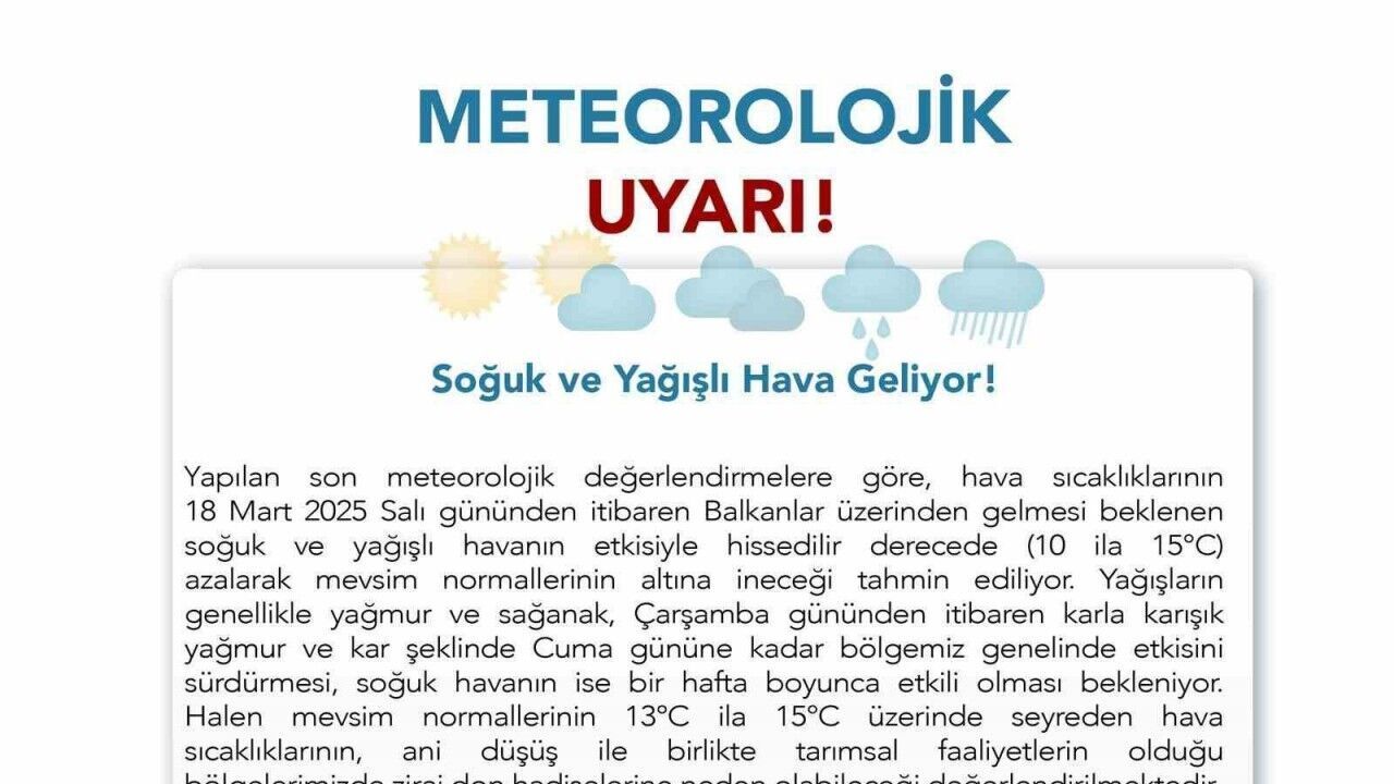 Çevre, Şehircilik ve İklim Değişikliği Bakanlığı Meteoroloji Genel Müdürlüğü tarafından yapılan açıklamada, "Kar yağışı, zirai don ve buzlanma hadiseleri ile ilgili hazırlıklı olunması, tahmin ve meteorolojik erken uyarıların takip edilmesi önem arz etmektedir. Salı gününden itibaren ilimizde en düşük ve en yüksek hava sıcaklıklarının -4/1C derece kadar düşmesi bekleniyor" ifadelerine yer verildi.
