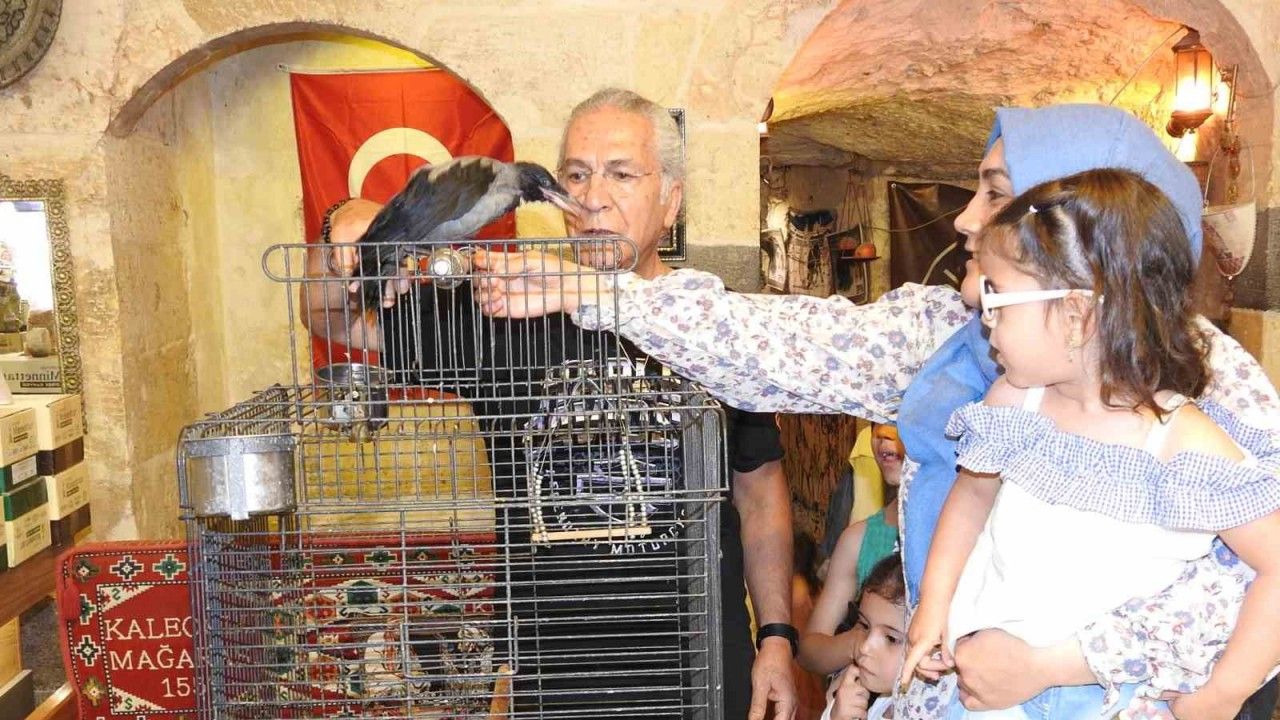 Yavru kargayı ölmek üzereyken kurtardığını belirten Mehmet Kaleoğlu, "Bundan 1 hafta veya 10 gün önce bir arkadaşım ölmek üzere yavru bir karga bulduğunu söyledi. Bakım yaptım ve besledim. Bana geldiğinde gerçekten baygın vaziyetteydi. Ama şu anda canlandı. Mağaraya ve bize alıştı. Mağaradan ayrılmak istemiyor. Gelen turistlerin ve çocukların bayağı dikkatini çekiyor. Ben de kendisine sahip çıkmak istiyorum" dedi.