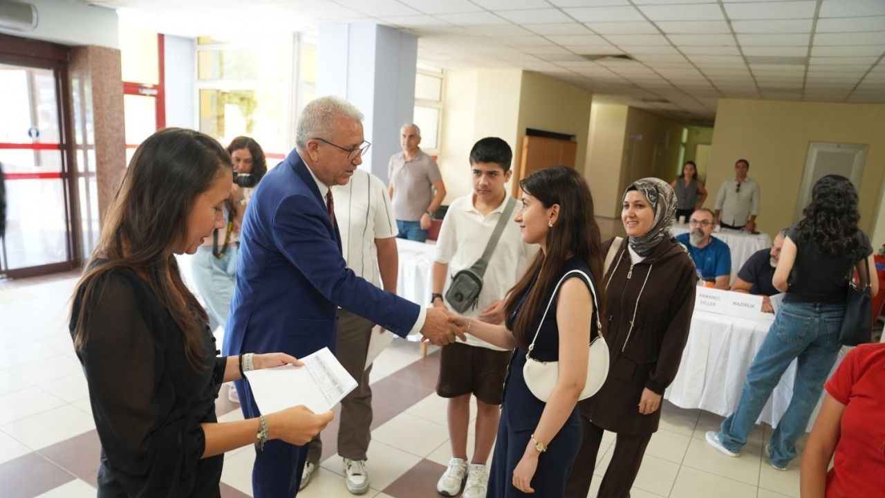 Ege Üniversitesi Rektörü Prof. Dr. Necdet Budak, Yükseköğretim Kurumları Sınavı (YKS) 2025 sonuçlarının açıklanmasının ardından kayıt heyecanı yaşayan çiçeği burnunda Egelileri yalnız bırakmadı. Üniversiteyi kazanan öğrencilerin kayıtlarını bizzat yapan Rektör Prof. Dr. Budak, öğrencilerin sevinçlerine ortak oldu. YKS-2025 yerleştirme sonuçlarına göre EÜ programlarına bu yıl toplam 7 bin 549 öğrenci yerleşti. Kayıt için aileleriyle birlikte kampüse gelen öğrenciler, EÜ Merkez Kütüphanesinde işlemlerini gerçekleştirdi.