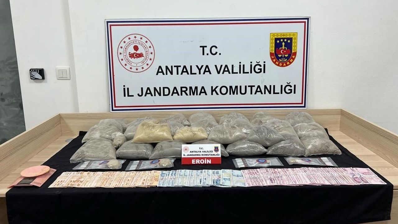 Antalya İl Jandarma Komutanlığı İstihbarat Şb Md.lüğü ve Kepez İlçe J.K.lığı ekipleri tarafından yapılan çalışmalar sonucunda Kepez ilçesinde bir şahsın evinde eroin maddesi üreterek piyasaya süreceğini tespit etti. Şüphelinin ikametinde yapılan aramada 46 kg eroin, 1 adet hassas terazi, 3 adet kurutma tepsisi, 2 adet öğütücü makinesi ve 19 bin 600 TL ele geçirildi. Olayla ilgili ikamet sahibi şüpheli S.Ö. tutuklandı.