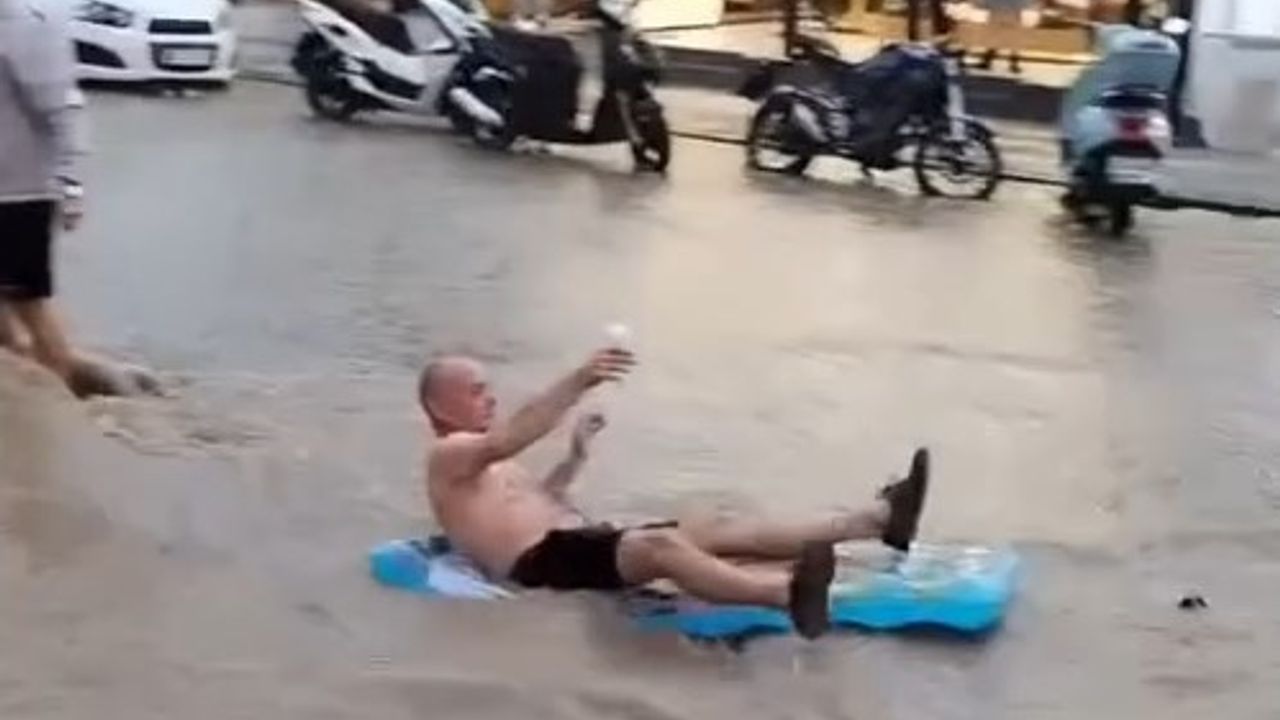 Muğla’nın Fethiye ilçesinde etkili olan sağanak yolları göle çevirirken, turistler sel sularında eğlendi.