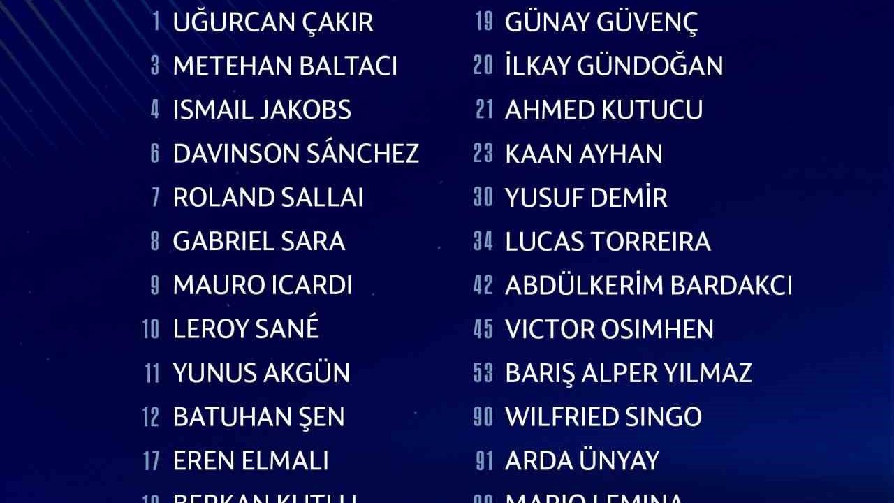 "Uğurcan Çakır, Metehan Baltacı, Ismail Jakobs, Davinson Sanchez, Roland Sallai, Gabriel Sara, Mauro Icardi, Leroy Sane, Yunus Akgün, Batuhan Şen, Eren Elmalı, Berkan Kutlu, Günay Güvenç, İlkay Gündoğan, Ahmed Kutucu, Kaan Ayhan, Yusuf Demir, Lucas Torreira, Abdülkerim Bardakcı, Victor Osimhen, Barış Alper Yılmaz, Wilfried Singo, Arda Ünyay, Mario Lemina."