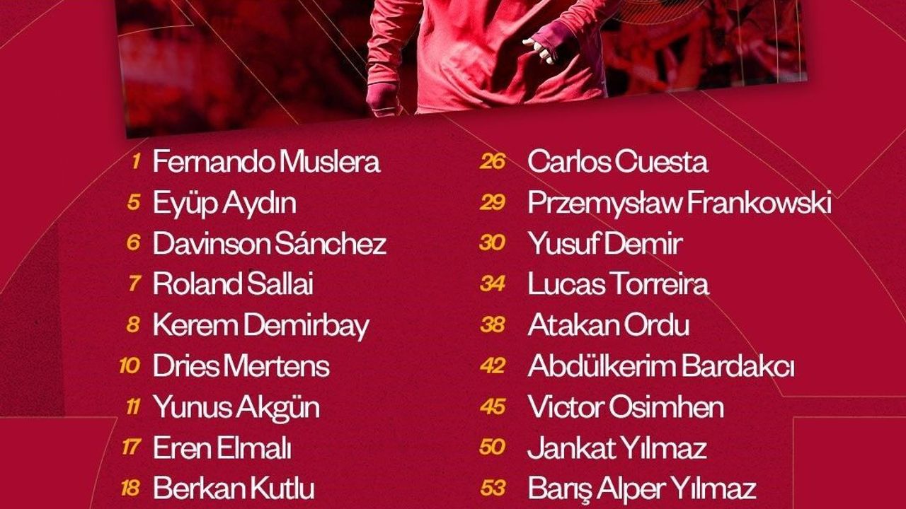 "Fernando Muslera, Eyüp Aydın, Davinson Sanchez, Roland Sallai, Kerem Demirbay, Dries Mertens, Yunus Akgün, Eren Elmalı, Berkan Kutlu, Günay Güvenç, Gabriel Sara, Ahmed Kutucu, Kaan Ayhan, Elias Jelert, Carlos Cuesta, Przemyslaw Frankowski, Yusuf Demir, Lucas Torreira, Atakan Ordu, Abdülkerim Bardakcı, Victor Osimhen, Jankat Yılmaz, Barış Alper Yılmaz, Berat Luş, Alvaro Morata, Efe Akman, Metehan Baltacı ve Mario Lemina."